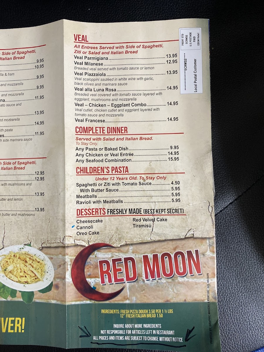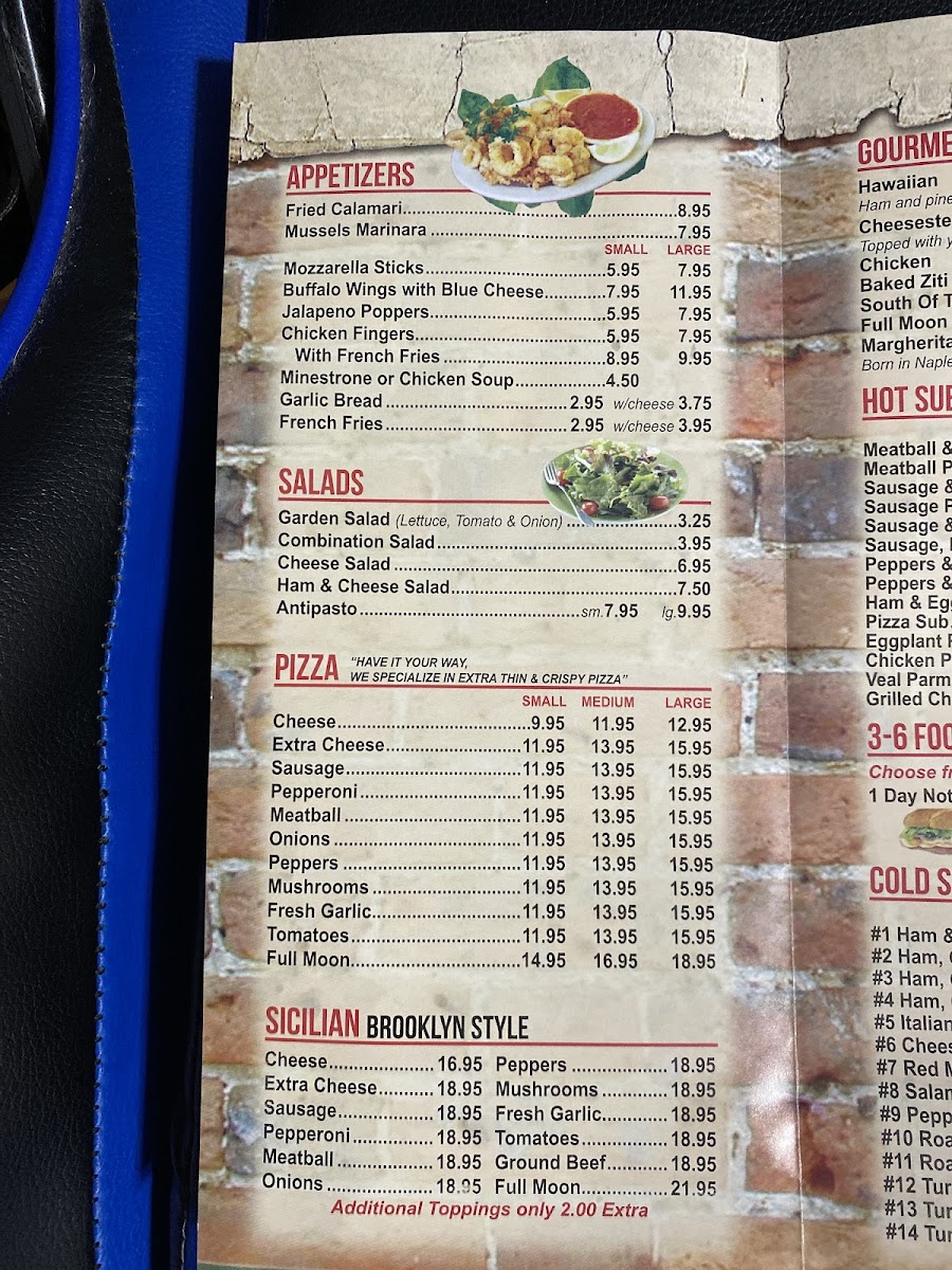 Welcome to Red Moon Pizzeria & Restaurant, a cherished gem nestled in Lakewood, NJ. Their menu is a delightful journey through classic Italian flavors, featuring standout dishes like Chicken Parmigiana and Veal Francese, all prepared with love and authentic ingredients. The pizzeria is not just about main courses—don't miss their variety of cold subs, such as the hearty Italian Sub and Red Moon Supreme that cater to all tastes.